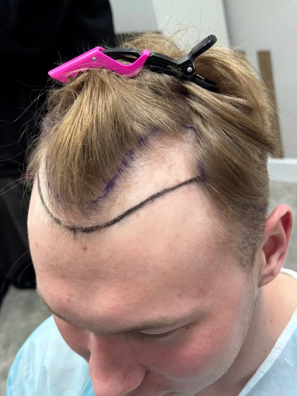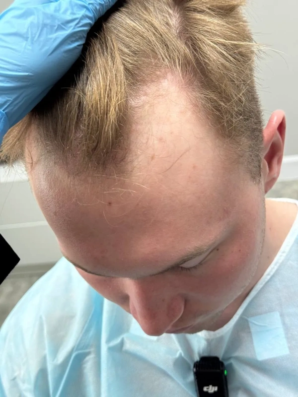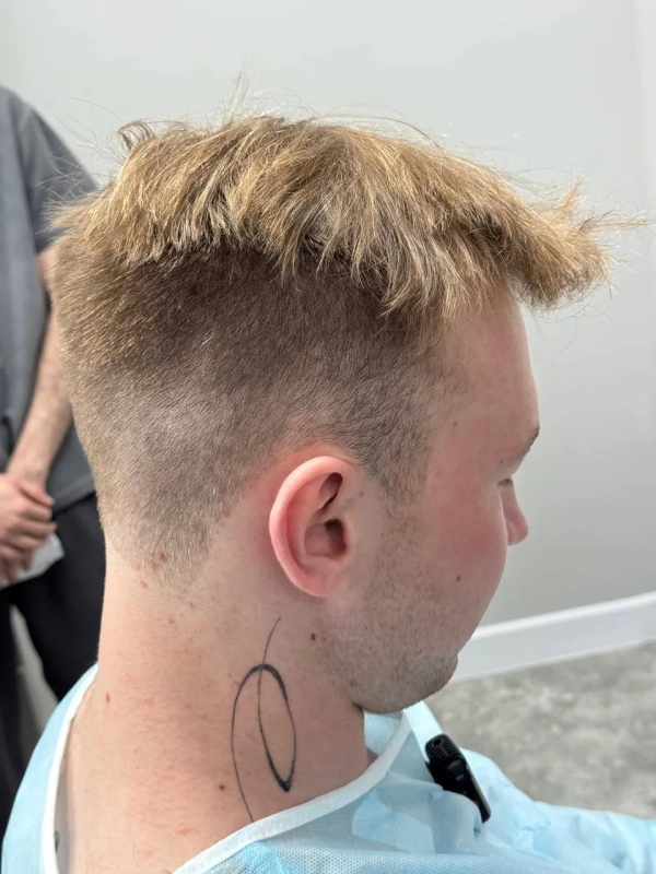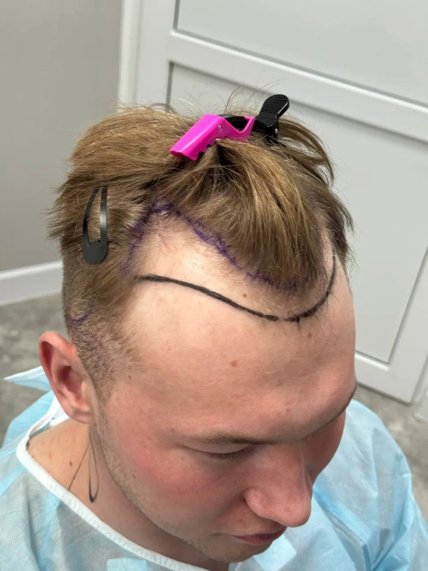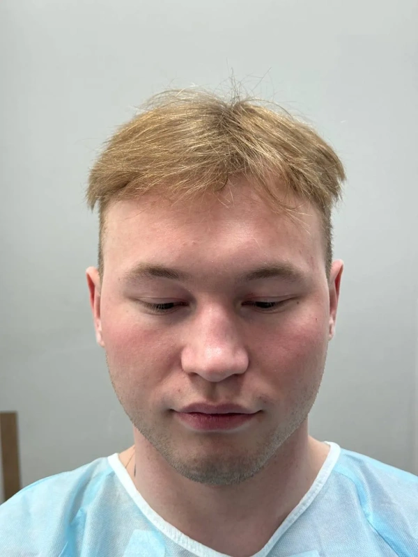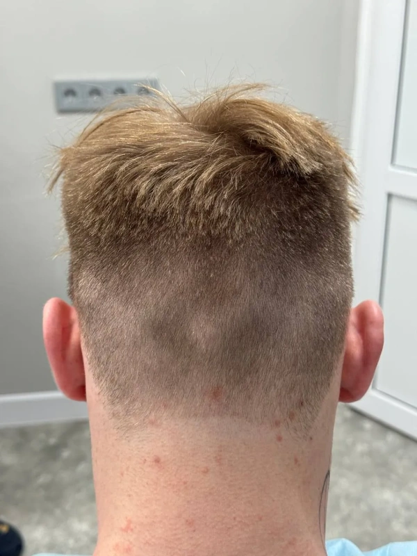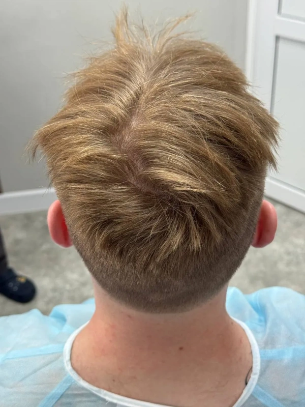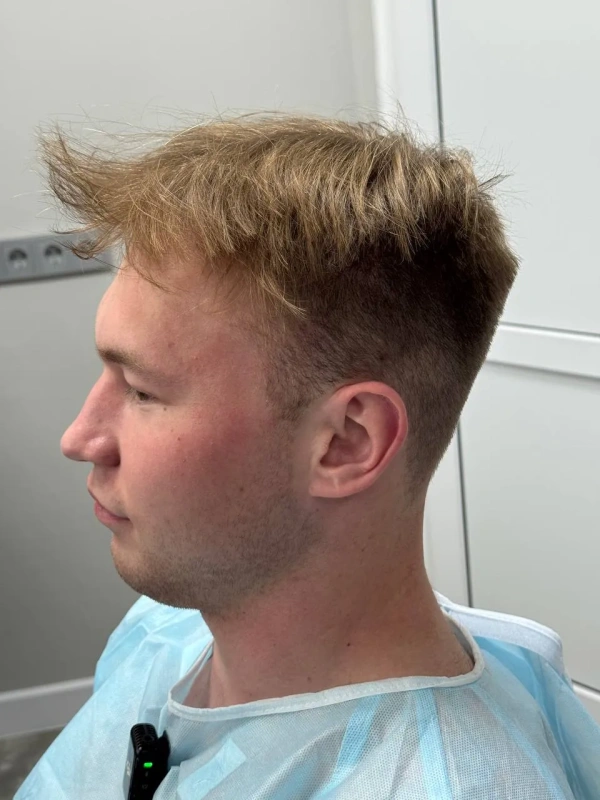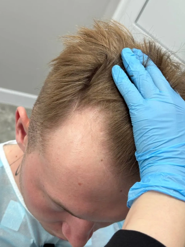 На первичной консультации мы провели тщательный анализ состояния волос и кожи головы. Диагностика показала, что зона облысения у Дамира относительно небольшая, что позволило нам применить щадящий подход. Чтобы сохранить привычный образ и избежать длительной реабилитации, мы отказались от полного бритья головы. Вместо этого была подстрижена только донорская зона (затылок) для комфортного извлечения графтов, большинство из которых содержали по 2 фолликула – идеальный материал для создания естественной густоты.